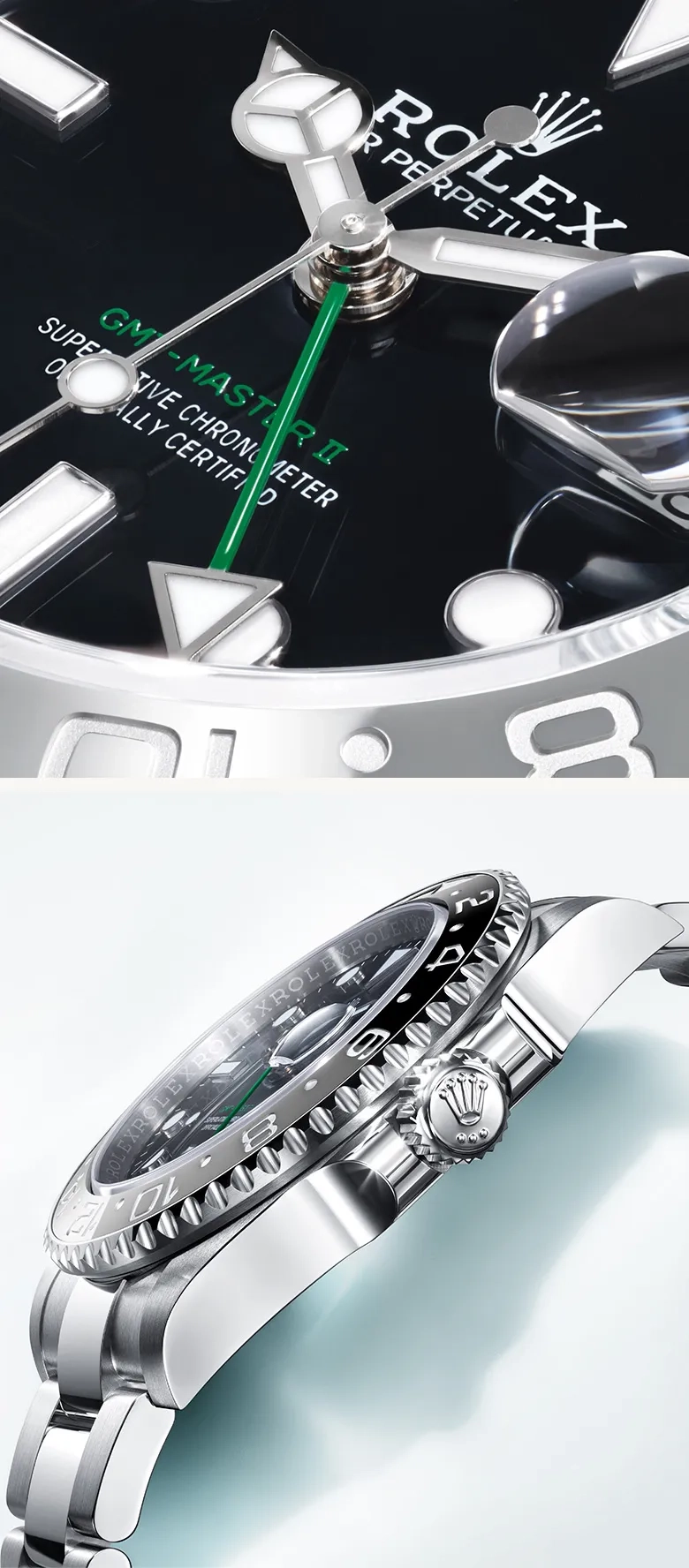 Den första är utrustad med ett Oyster-armband, medan den andra har ett Jubilee-armband. Den svarta lackerade urtavlan bär inskriptionen ’GMT-Master II’ i grönt, som speglar färgen på den triangelformade 24-timmarsvisaren – ett element som är utmärkande i modellens design.