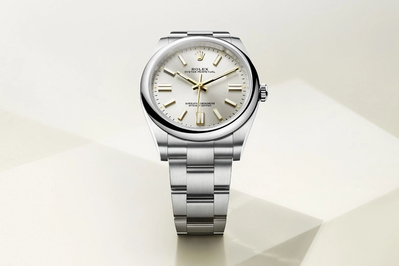 Oyster Perpetual-klockorna är ättlingar i rakt nedstigande led till den ursprungliga Oyster-klockan som lanserades 1926. Den var världens första vattentäta armbandsklocka, och den klocka som Rolex har byggt sitt anseende på. Oyster Perpetual är en certifierad Superlative Chronometer och har alla de viktiga egenskaperna i Oyster Perpetual-kollektionen – utmärkt kronometrisk precision, den vattentäta Oyster-boetten och ett mekaniskt självuppdragande urverk med Perpetual-rotor. Detta diskreta och eleganta ur är känt för sin universella och klassiska stil.